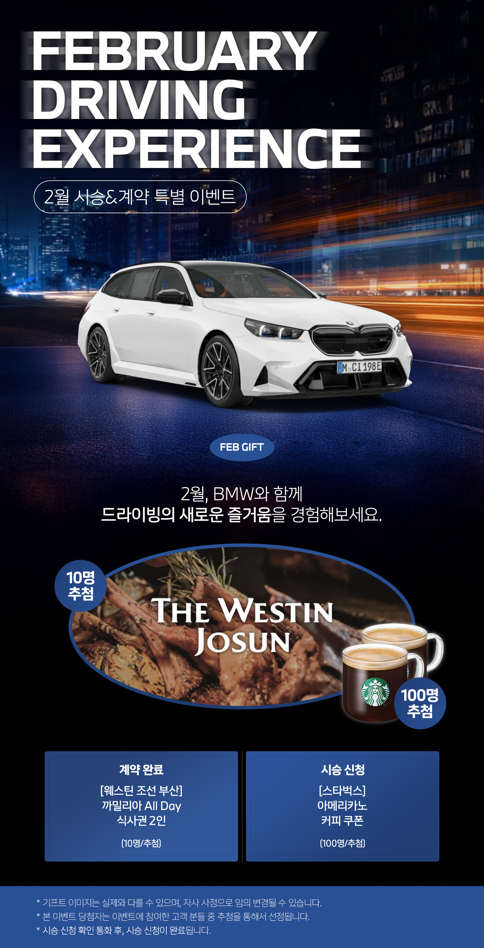비엠더블유코리아㈜는 고객님께 행사 진행에 관련한 필요한 업무 중 일부를 외부 업체로 하여금 수행하도록 개인정보를 위탁하고 있으며, 위탁 받은 업체가 개인정보보호 관계 법령을 위반하지 않도록 관리∙감독하고 있습니다. 업무 위탁 관련 자세한 내용과 변경사항은 비엠더블유코리아㈜ 홈페이지 www.bmw.co.kr 개인정보처리방침에서 확인하실 수 있습니다.