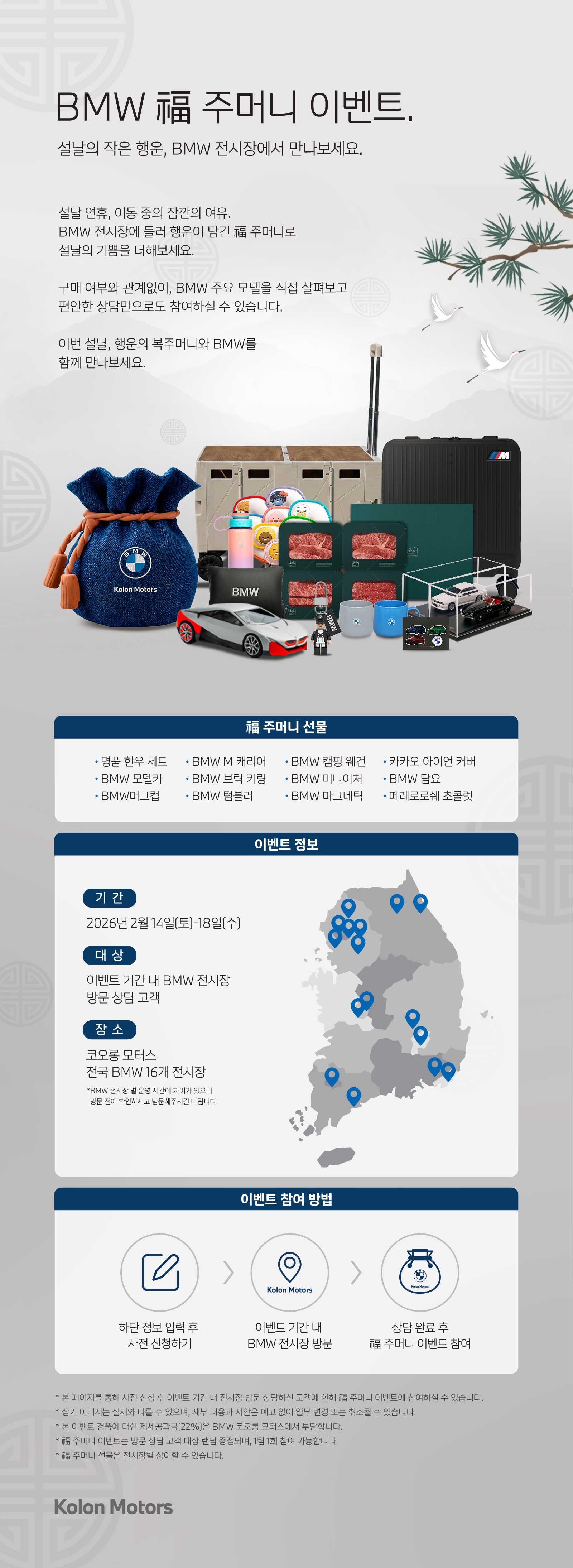 비엠더블유코리아㈜는 고객님께 행사 진행에 관련한 필요한 업무 중 일부를 외부 업체로 하여금 수행하도록 개인정보를 위탁하고 있으며, 위탁 받은 업체가 개인정보보호 관계 법령을 위반하지 않도록 관리∙감독하고 있습니다. 업무 위탁 관련 자세한 내용과 변경사항은 비엠더블유코리아㈜ 홈페이지 www.bmw.co.kr 개인정보처리방침에서 확인하실 수 있습니다.